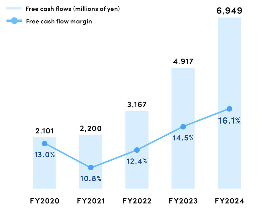 Our free cash flow has continued to expand steadily, supported by net sales growth and improvement in the adjusted operating profit margin, reaching 6.9 billion yen in FY2024. Although one-time expenses were incurred for the acquisition of non-current assets associated with our head office relocation, our free cash flow margin still rose 1.6 pts. year on year, to 16.1%, remaining at a highly sound level.