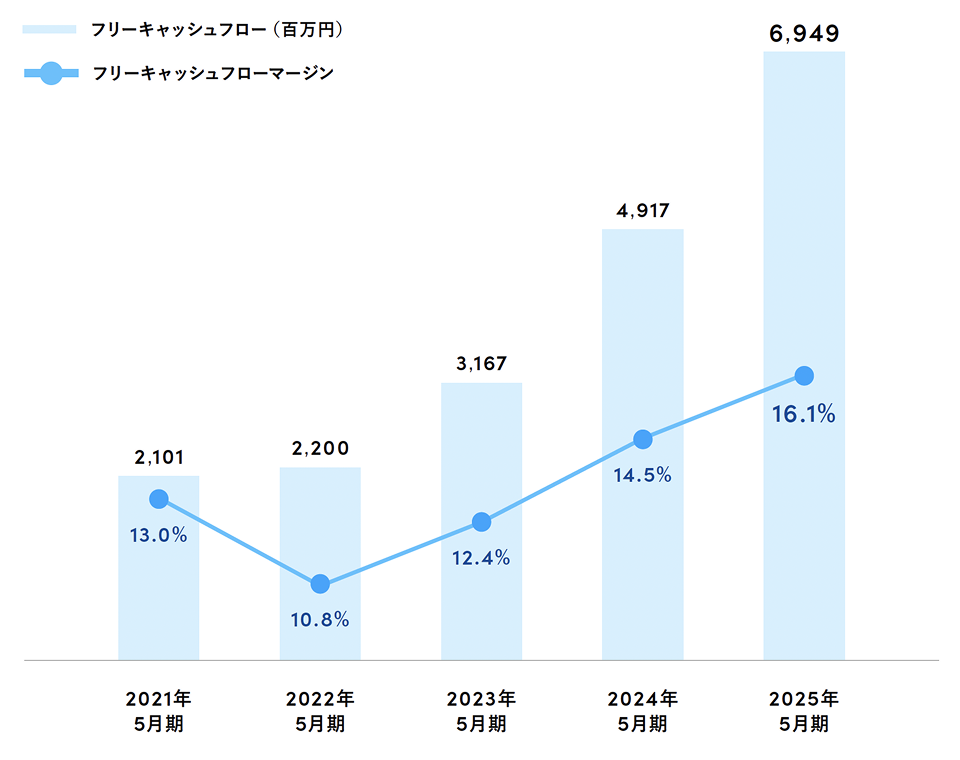 当社のフリーキャッシュフローは、売上高の成長と調整後営業利益率の改善を背景に着実に拡大を継続しており、2025年5月期は69億円となりました。本社移転に伴い、固定資産取得に係る一時的な支出が発生しましたが、それを踏まえても、フリーキャッシュフローマージンは前年同期比1.6ポイント増の16.1%となり、非常に健全な水準を維持しています。